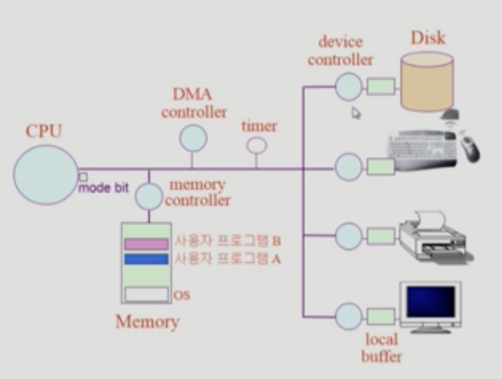 - mode bit: CPU내에서 실행되는 것이 운영체제인지 사용자 프로그램인지 구분해준다.
